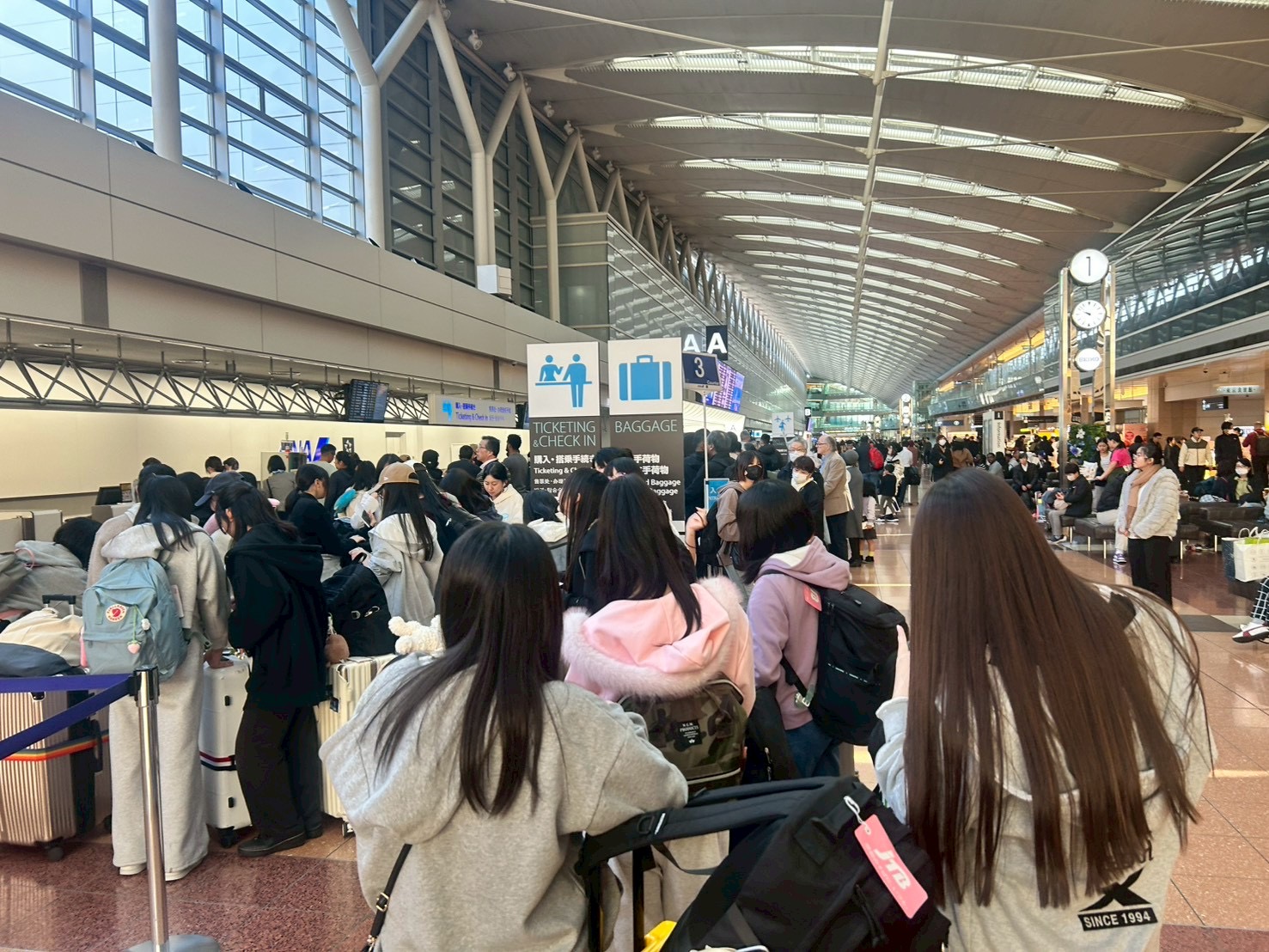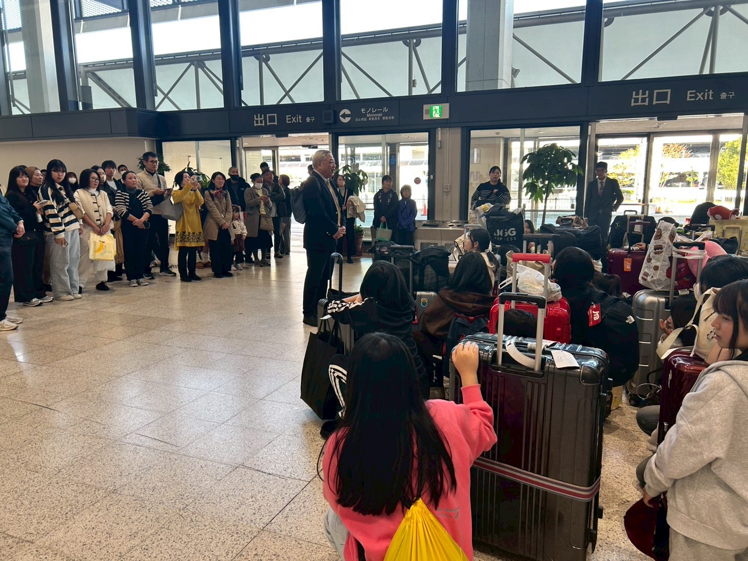 大阪伊丹空港に到着。キャリーケースを受け取ってクラスごとに整列して空港のターミナルに向かいます。きりっと成長した顔で向かおう!という話を事前にしていましたが、出口で待ち構えてくれた多くのご家族を前にするとやはり笑顔は隠し切れません。