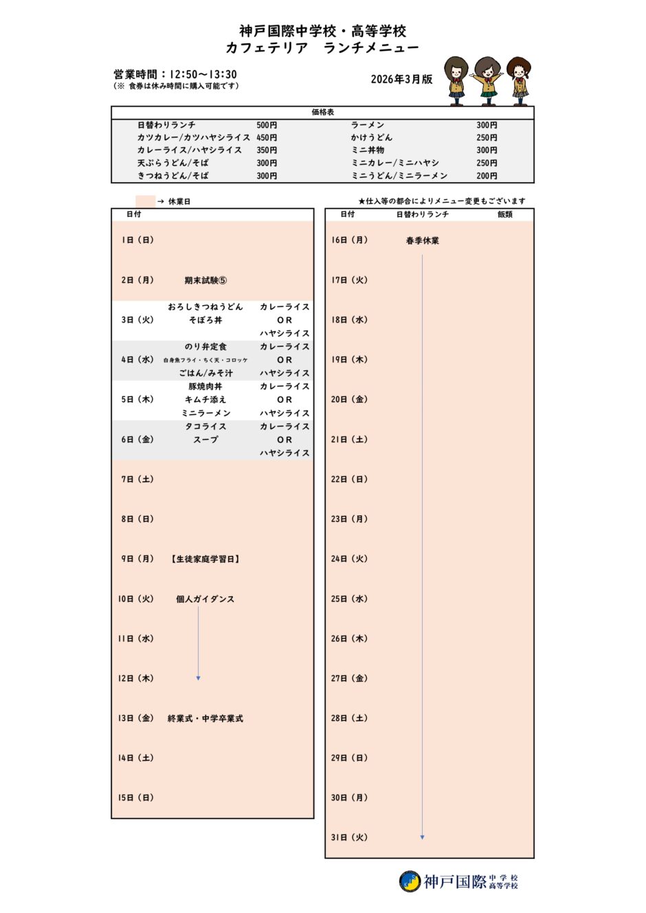 ホームカフェテリアメニュー 3月のカフェテリアメニュー 2026年3月2日 SHARE ツイート シェア はてブ LINE Pocket お待たせいたしました。3月のカフェテリアメニューになります。 カフェテリア月間メニュー_2025年度3月 神戸国際中学校・高等学校 コメントを残す コメントをキャンセルメールアドレスが公開されることはありません。 ※ が付いている欄は必須項目ですコメント ※ 名前 ※ メール ※ サイト 次回のコメントで使用するためブラウザーに自分の名前、メールアドレス、サイトを保存する。